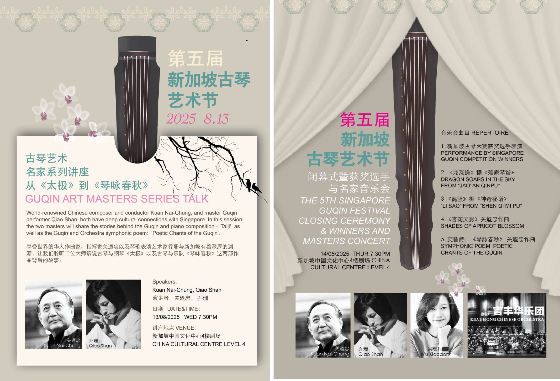 Following our major event, the Singapore Guqin Art Festival in Fuding, the focus of the Art Festival returns to Singapore in August. This time, we invited two masters, Kuan Nai-Chung and Qiao Shan, as well as several winners of the Guqin Competition, to perform in Singapore during our two-day activities.